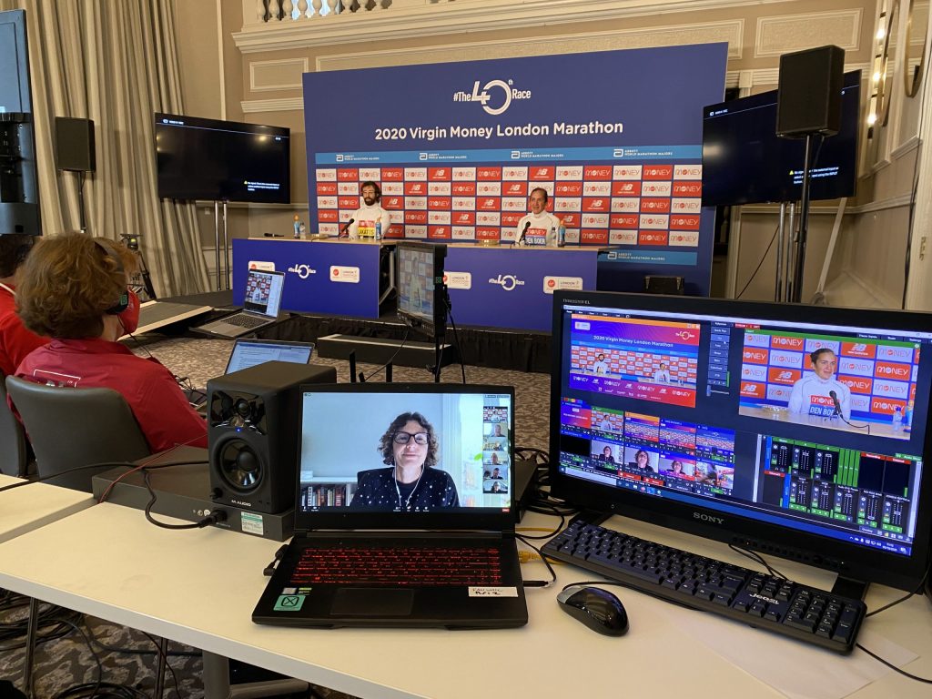 Over Exposed were contracted to take the usual press conference and make it virtual for the first time in London Marathons history. Throughout the pandemic we have seen how press conferences with football clubs e.t.c. have been held via zoom but this method of course has its limitations. This method relies on a laptop webcam and microphone and the video is limited to 640 x 360 pixels which isn’t the standard 1920 x 1080 suitable for live broadcast. You also don’t have the clean audio from the athletes.